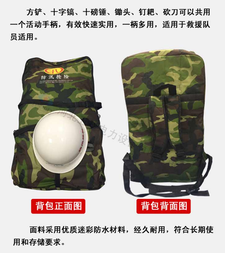 防汛組合工具包19件套:鎬、鈀、鋤頭、十磅錘、砍刀、方鏟、電筒、水鞋、防汛戰斗服、防寒雨衣、救生繩、雙背帶、救生衣、毛巾、水壺、頭盔、消防斧頭、信號燈、工具包。該組合工具包輕便、工具配備齊全適用于救援隊員使用。