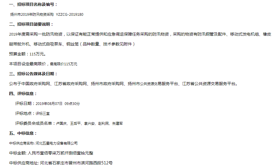 熱烈祝賀河北五星揚州市2019年防汛物資采購一舉中標!
